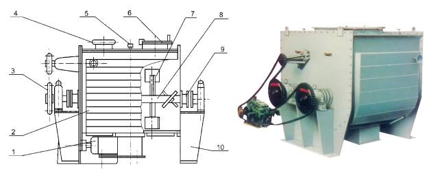 1、电机及减速机 2、夹套 3、链轮 4、进料口 5、喷液装置 6、人孔 7、桨叶 8、主轴 9、密封装置 10、出料阀 注:标准型混合机不带夹套及喷液装置