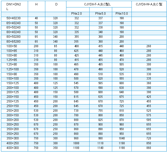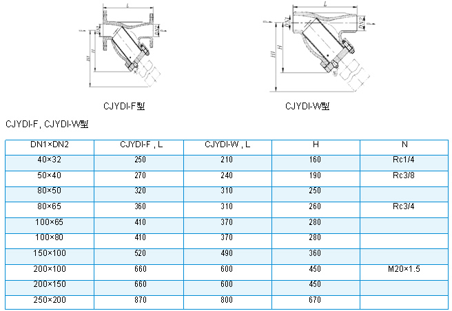 (3)Y型铸造异径法兰连接式(CJYDI-F型)、异径对焊连接式(CJYDI-W型)(DN40×32~250×200,PN≤5.0MPa)