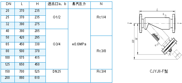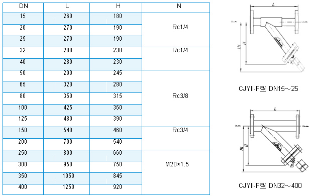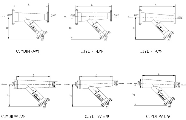 (5)、Y型焊接法兰连接式(CJYII-F型)(DN15~400、PN≤5.0MPa) (6)、Y型带夹套焊制法兰连接式(CJYJII-F型)(DN20~200,PN≤5.0MPa)